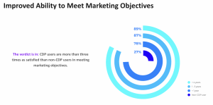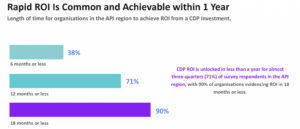 - Despite market uncertainty, marketing budgets are expected to increase:Â In 2022, 65% of CDP users in the APJ region increased year-over-year (YoY) marketing investment in a first-party data strategy. More tenured CDP users reported the largest overall increase in marketing spend, suggesting a greater ability to accurately forecast spending and ROI. Specifically, seasoned APJ CDP users reported marketing investment at more than double the rate of non-CDP users.