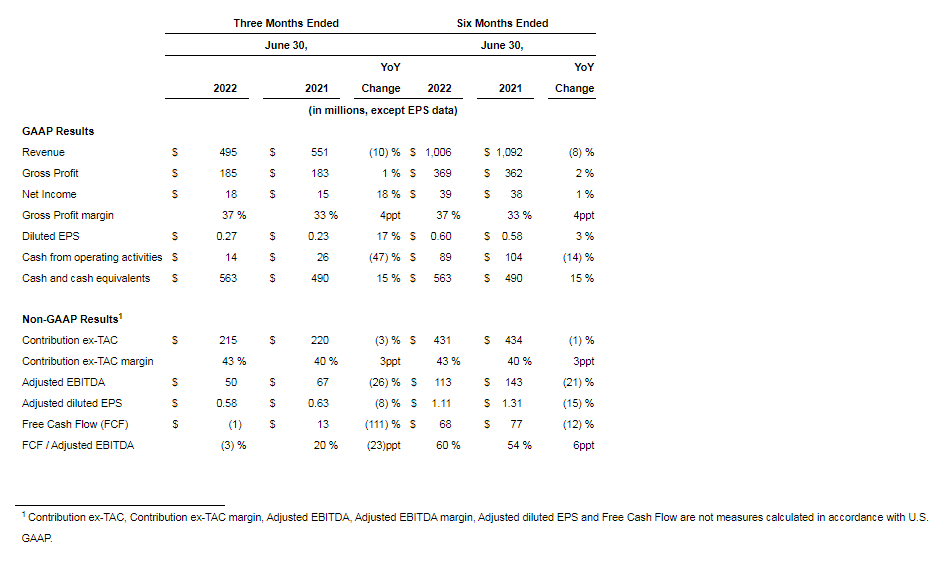 Revenue decreased by 10% year-over-year in Q2 2022, or 3% at constant currency, to $495 million (Q2 2021: $551 million). Gross profit increased by 1% year-over-year in Q2 2022 to $203 million (Q2 2021: $183 million). Gross profit as a percentage of revenue, or gross profit margin, was 37% (Q2 2021: 33%). Contribution ex-TAC in the second quarter decreased 3% year-over-year, or increased 7% at constant currency, to $215 million (Q2 2021: $220 million). Contribution ex-TAC as a percentage of revenue, or Contribution ex-TAC margin, was 43% (Q2 2021: 40%), up 300 basis points year-over-year, largely driven by Retail Media and the acceleration of our client transition to the Company’s platform.