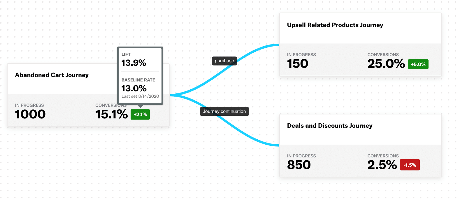 Airship Journeys enables an at-a-glance understanding of how cross-channel journeys are performing against business goals, trending performance lifts against control group baselines to direct optimization efforts and maximize business value.