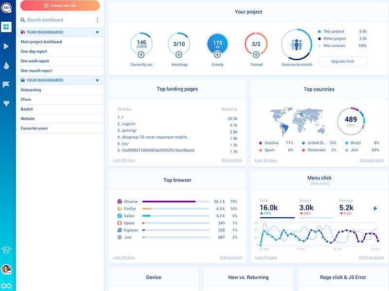 - Redesigned Dashboard: Smartlook NextGen brings visibility and accessibility to the forefront, giving users more insight and more control, while still being easy to use. The new vertical bar panel now always displays a list of a user’s project and saved analytics.