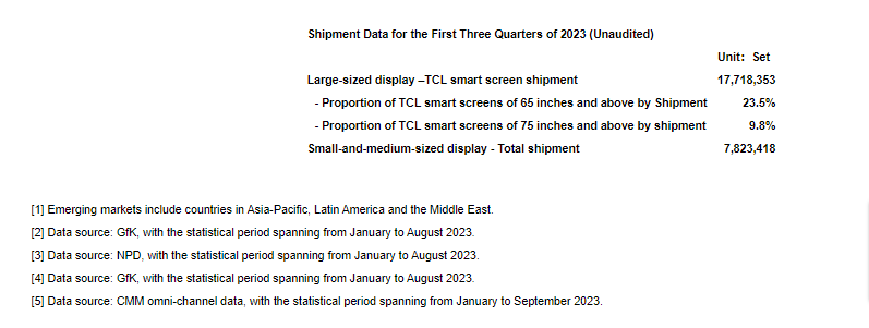 In the PRC market, the shipment of TCL smart screen slightly increased by 1.7% YoY, ranking the second in terms of retail sales revenue[5]. Large-sized smart screens continued to account for a growing proportion of shipment. In the first three quarters of 2023, shipment of 65-inch and above TCL smart screens increased by 33.1% YoY, accounting for 51.4% of total shipment in the PRC market, an increase of 12.1 percentage points YoY. Shipment of 75-inch and above TCL smart screens accounted for 30.2% of total shipment in the PRC market, an increase of 12.1 percentage points YoY.