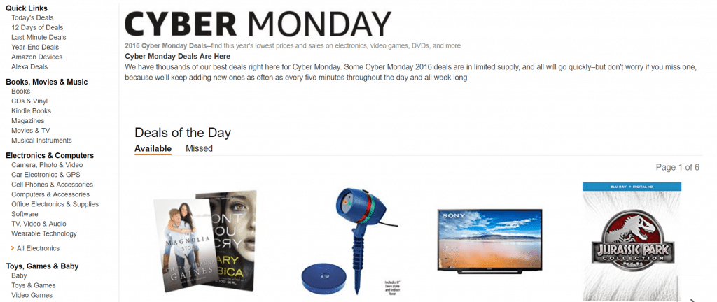To make shoppers come back to the site for more, for the past few years Amazon has created a Deals of the Day segment split into ‘Available’ and ‘Missed’, a good little trick to create a sense of urgency among the buyers.